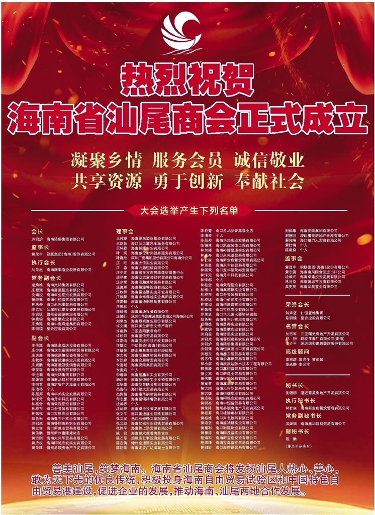 善美汕尾,筑梦海南。海南省汕尾商会将发扬汕尾人热心、善心,敢为天下先的优良传统,积极投身海南自由贸易试验区和中国特色自由贸易港建设,促进企业的发展,推动海南、汕尾两地合作发展。