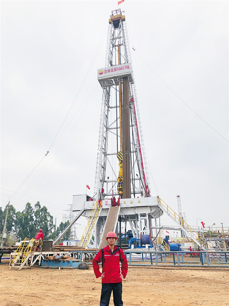 第二张:在海南澄迈,李德威双手叉腰,身后是高高耸立的干热岩钻井台,脸上挂着淡淡的微笑。