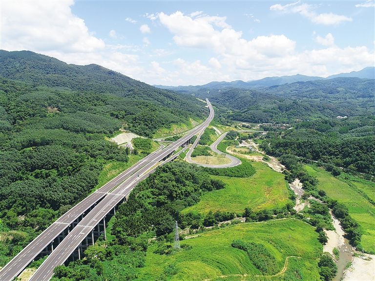 9月21日,琼乐高速公路开通前,交通部门组织媒体记者提前了解公路建设情况并体验。图为青山绿水间的琼乐高速公路美景。
