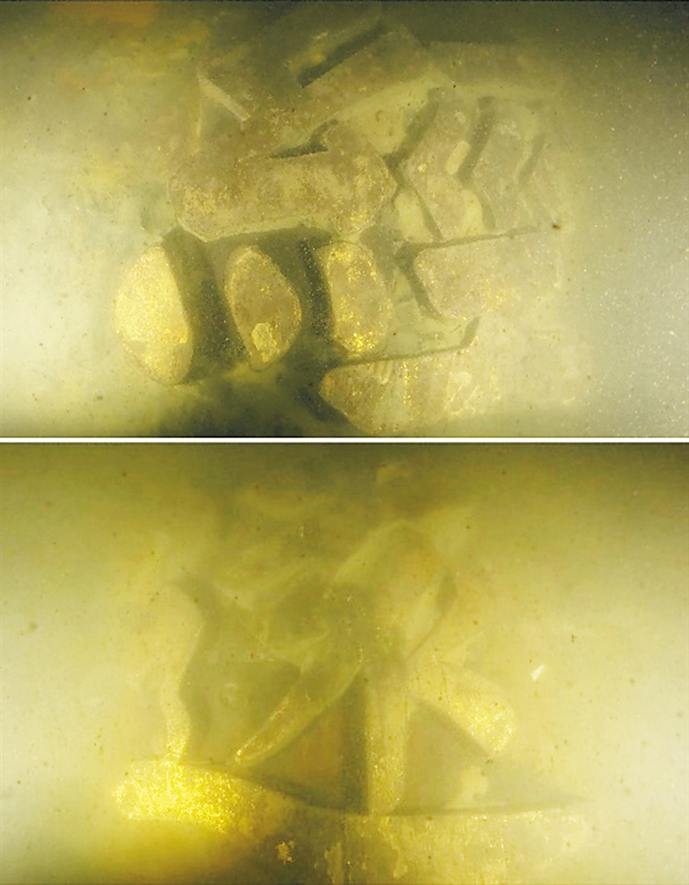 本月15日,水下考古队员发现悬挂于舰舷外壁的舰名字牌,由此确证沉舰即为“经远舰”。此外,水下考古者还清理出铁、木、铜、铅、玻璃、陶瓷、皮革等材质各类遗物标本500余件,种类十分丰富。