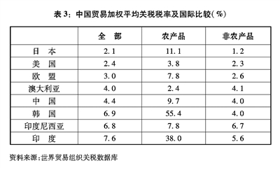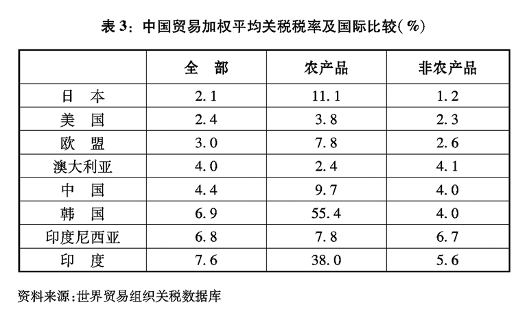 事实上,中国在切实履行加入世界贸易组织承诺后,还主动通过单边降税扩大市场开放。截至2010年,中国货物降税承诺全部履行完毕,关税总水平由2001年的15.3%降至9.8%。中国并未止步于履行加入世界贸易组织承诺,而是通过签订自由贸易协定等方式推进贸易投资自由化,给予最不发达国家关税特殊优惠,多次以暂定税率方式大幅自主降低进口关税水平。根据世界贸易组织数据,2015年中国贸易加权平均关税税率已降至4.4%,明显低于韩国、印度、印度尼西亚等新兴经济体和发展中国家,已接近美国(2.4%)和欧盟(3%)的水平;在农产品和制成品方面,中国已分别低于日本农产品和澳大利亚非农产品的实际关税水平(表3)。2018年以来,中国进一步主动将汽车整车最惠国税率降至15%,将汽车零部件最惠国税率从最高25%降至6%;大范围降低部分日用消费品进口关税,涉及1449个税目,其最惠国平均税率从15.7%降至6.9%,平均降幅达55.9%。目前,中国关税总水平已进一步降为8%。