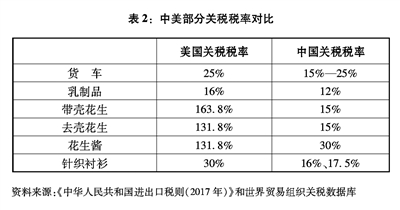 世界贸易组织所提倡的互惠互利原则,是各国就所有产业开放市场实现总体互惠和利益平衡,并非狭义局限于每个产业或产品承诺水平对等。由于资源禀赋、产业竞争力的差异,很难实现两个经济体绝对对等开放,不同产业关税水平是有差异的。如果按照美国绝对对等逻辑,美国自身也有大量不公平和不对等的情况。例如,中国对带壳花生、乳制品和货车征收的关税分别为15%、12%和15%-25%,而据世界贸易组织关税数据显示,美国相应的关税分别为163.8%、16%和25%,均高于中国(表2)。