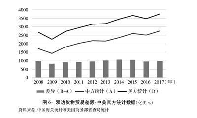 此外,美国统计方法相对高估了中美货物贸易逆差额。中美双方的统计差异长期存在,且差异较大。2017年,中国统计对美货物贸易顺差为2758亿美元,美国统计对华逆差接近3958亿美元,相差1000亿美元左右。由中美两国商务部相关专家组成的统计工作组,每年就中美贸易统计差异进行一次比较研究。根据该工作组测算,美国官方统计的对华贸易逆差每年都被高估20%左右。根据中国海关和美国商务部普查局的统计,双方统计结果在最近十年来的走势和变动幅度大致相同(图6)。引起差异的原因包括进口价格和出口价格之间的差异、转口贸易增值、直接贸易加价、地理辖区、运输时滞等。