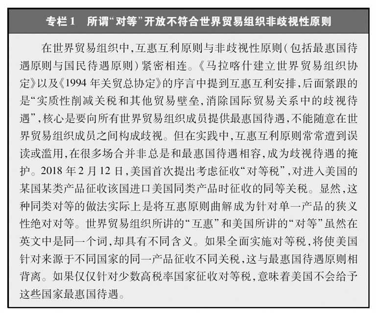世界贸易组织所提倡的互惠互利原则,考虑了各国发展阶段的差别。在世界贸易组织框架下,发展中成员享有差别和更优惠待遇。这种制度安排是在尊重发展中国家和地区发展权的基础上,积极吸纳新的发展中成员加入,以扩大成员数量、增强多边体制的包容性,也体现了以当期优惠换取后期开放的互惠原则。对于发展中成员而言,由于其处于发展初期阶段,需要对产业适度保护以促进良性发展,其市场随经济发展扩大后,也将为发达国家带来更多商业机会。发展中成员享有差别和更优惠待遇,符合包括发达成员在内的各国各地区长期利益,这种制度安排是真正意义上的国际公平。2001年,中国通过多边谈判以发展中成员身份加入世界贸易组织,享受发展中成员待遇。十几年来,中国经济实现了快速发展,但仍然是一个发展中国家。由于中国有13.9亿人口,经济总量数据显得较为庞大,但这没有改变人均发展水平较低的现实。根据国际货币基金组织数据,2017年中国人均国内生产总值8643美元,仅为美国的14.5%,排在世界第71位。2017年末中国还有3046万农村贫困人口。仅以中国经济和贸易总规模较大为依据,要求中国和美国实现关税绝对对等是不合理的。美国追求绝对对等的做法,违背了世界贸易组织最惠国待遇和非歧视性原则(专栏1)。