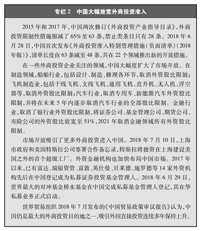 除此之外,中国在某些领域的股权合作符合中国的国际义务、各国惯例和实践,不能被混淆为“强制技术转让”。而且,近几年中国对外商投资的股权限制不断放开,外国企业自由选择权不断扩大(专栏2)。在此过程中,中外企业股权合作仍然不断深化,完全是双方基于商业原因的自由选择。