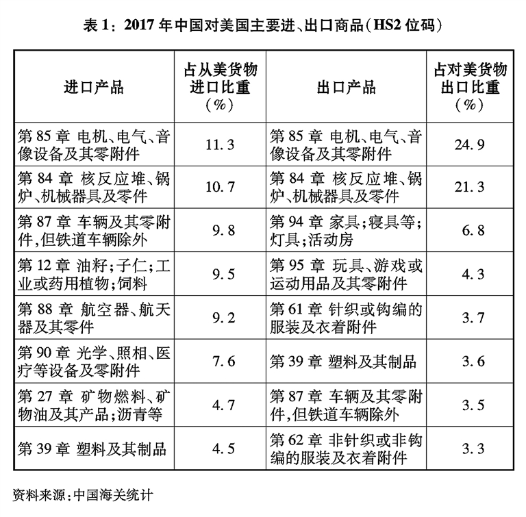 中美双边贸易互补性强。美国居于全球价值链的中高端,对华出口多为资本品和中间品,中国居于中低端,对美出口多为消费品和最终产品,两国发挥各自比较优势,双边贸易呈互补关系。2017年中国向美国出口前三大类商品为电机电气设备及其零附件、机械器具及零件、家具寝具灯具等,合计占比为53.5%。中国从美国进口前三大类商品为电机电气设备及其零附件、机械器具及零件、车辆及其零附件,合计占比为31.8%。机电产品在中美双边贸易中占重要比重,产业内贸易特征较为明显(表1)。中国对美出口的“高技术产品”,大多只是在华完成劳动密集型加工环节,包含大量关键零部件和中间产品的进口与国际转移价值。
