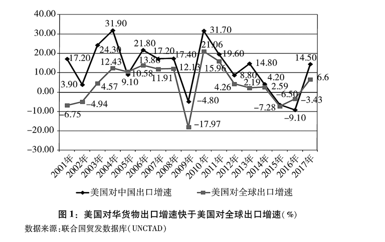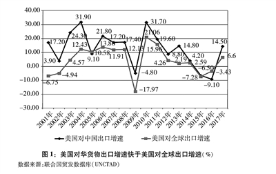 美国对华出口增速明显快于其对全球出口。中国加入世界贸易组织以来,美国对华出口快速增长,中国成为美国重要的出口市场。根据联合国统计,2017年美国对华货物出口1298.9亿美元,较2001年的191.8亿美元增长577%,远远高于同期美国对全球112%的出口增幅(图1)(注1)。