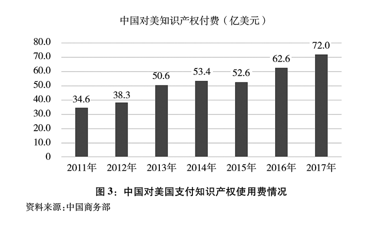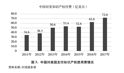 中国对美国支付知识产权使用费持续增加。据中国有关方面统计,美国是中国第一大版权引进来源国,2012-2016年,中国自美国引进版权近2.8万项。中国对美国支付的知识产权使用费从2011年的34.6亿美元增加至2017年的72亿美元,6年时间翻了一番(图3)。其中2017年中国对美支付占中国对外支付知识产权使用费总额的四分之一。