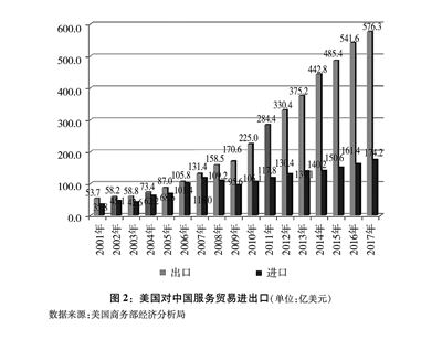美国是中国服务贸易最大逆差来源地,且逆差快速扩大。据美国方面统计,2007-2017年,美国对华服务出口额由131.4亿美元扩大到576.3亿美元,增长了3.4倍,而同期美国对世界其他国家和地区的服务出口额增长1.8倍,美国对华服务贸易年度顺差扩大30倍至402亿美元(图2)。