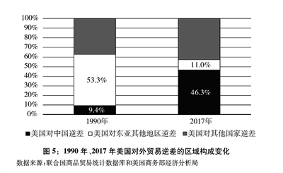 第三,这是国际分工和跨国公司生产布局变化的结果。随着全球价值链和国际分工深入发展,跨国公司利用中国生产成本低、配套生产能力强、基础设施条件好等优势,来华投资设厂组装制造产品,销往包括美国在内的全球市场。从贸易主体看,据中国海关统计,2017年中国对美货物贸易顺差的59%来自外商投资企业。随着中国承接国际产业转移和融入亚太生产网络,中国在很大程度上承接了过去日本、韩国等其他东亚经济体对美的贸易顺差。据美国商务部经济分析局统计,日本、韩国等东亚经济体占美国总逆差的比值,由1990年的53.3%下降为2017年的11%,同期中国对美贸易顺差的占比则由9.4%上升为46.3%(图5)。
