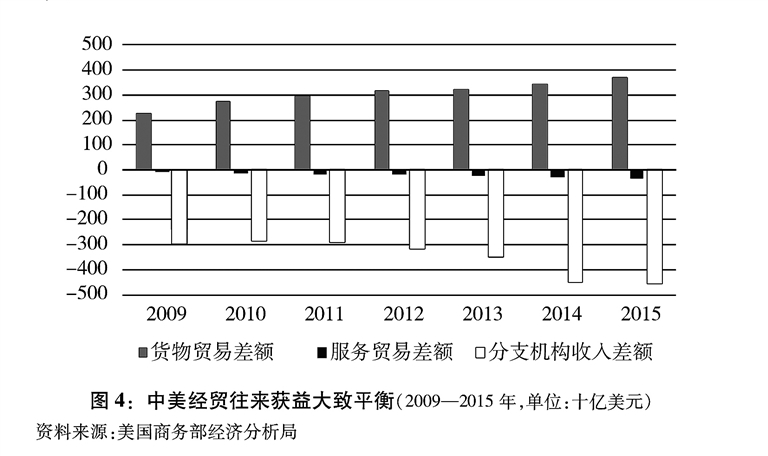 在经济全球化深入发展、国际化生产普遍存在的今天,双边经贸关系内涵早已超出货物贸易,服务贸易和本国企业在对方国家分支机构的本地销售额(即双向投资中的本地销售)也应考虑进来。综合考虑货物贸易、服务贸易和本国企业在对方国家分支机构的本地销售额三项因素,中美双方经贸往来获益大致平衡,而且美方净收益占优(图4)。根据中国商务部统计,2017年美国对华服务贸易顺差为541亿美元,美国在服务贸易方面占有显著优势。根据美国商务部经济分析局数据,2015年美资企业在华销售额高达4814亿美元,远高于中资企业在美256亿美元的销售额,美国占有4558亿美元的优势,美国企业跨国经营优势更为突出。2018年6月德意志银行发布的研究报告《估算美国和主要贸易伙伴之间的经济利益》认为,从商业利益角度分析,考虑到跨国公司的全球经营对双边经贸交往的影响,美国实际上在中美双边贸易交往过程中获得了比中国更多的商业净利益。根据其计算,扣除各自出口中其他国家企业子公司的贡献等,2017年美国享有203亿美元的净利益(注12)。