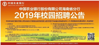 详情请登录中国农业银行招聘网站进行咨询或致电:(0898)66777728、68571939,陈老师、王老师。