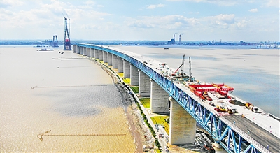当日,沪通长江大桥正式摊铺桥面沥青。沪通长江大桥连接江苏南通市和张家港市,主跨1092米,建成后将成为长三角地区沿海重要的铁路、公路过江通道。 新华社发(许丛军 摄)