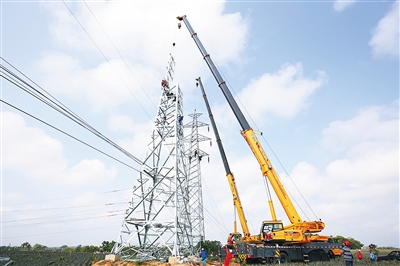 组装塔材、吊车吊着塔材徐徐升起、螺栓紧固……一群身着南方电网蓝色工作服,头带安全帽的电力员工正在紧张地施工,现场热火朝天、一片繁忙。
