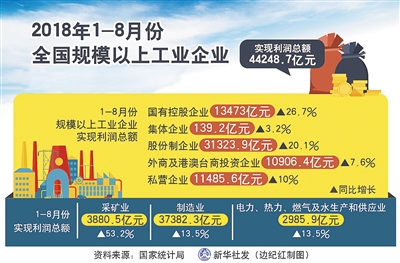 1至8月份,在41个工业大类行业中,34个行业利润总额同比增加,7个行业减少。其中,石油和天然气开采业增长4.4倍,黑色金属冶炼和压延加工业增长80.6%,有色金属冶炼和压延加工业下降13.8%,汽车制造业下降2.1%。