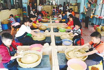 “行军”队伍还未抵达,金江镇塘北村贫困户邱海金便已经忙活起来。她的工作是给参加红色之旅的党员们准备“忆苦饭”。