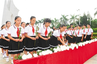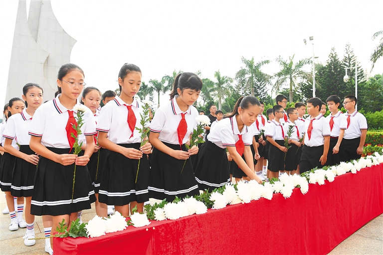 9月30日上午,学生代表在海口市金牛岭解放海南岛战役烈士陵园向革命烈士献花。 本报记者 王凯 摄