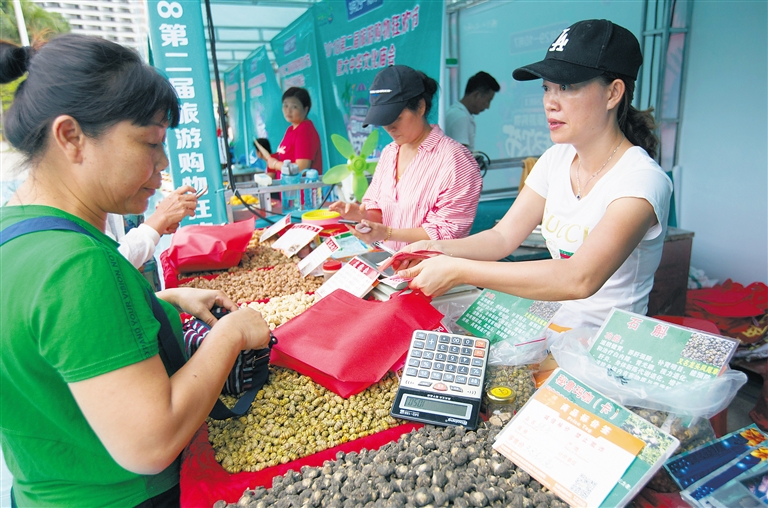 “这次旅游购物狂欢节,我们带来香粉蕉、火龙果、百香果和鹧鸪茶几个特色农产品,很受欢迎。不到一天时间,400多斤百香果鲜果已经卖完了。”9月30日中午,海南滴滴沃家生态农业科技发展有限公司的黄凌燕对记者说,“今天有家山东的电子商务平台联系我,有意向代销我们的产品,我们正准备进行详细地洽谈。我希望能够参加更多这样的扶贫农产品展销活动,拓宽农产品销售渠道,帮助更多农民增收。”