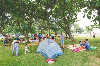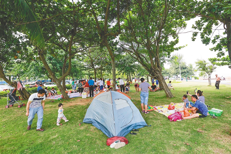 10月3日,海口市西海岸,家长带着孩子在玩耍,陪孩子度过快乐假期。本报记者 陈元才 摄