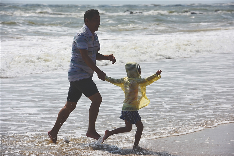 10月3日,家长带着孩子在博鳌海滨与大海亲密接触。特约记者 蒙钟德 摄