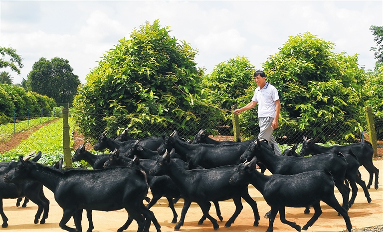 日前,海口市美兰区三江镇厚大村村民符圣明赶着45头黑山羊到山坡上吃草。2015年底,符圣明家被列为建档立卡贫困户。2016年,符圣明经常参加脱贫电视夜校和技能培训,黑山羊越养越多。当年底符圣明一家顺利脱贫。今年,他被美兰区政府聘为“田教授”,常向其他村民传授养羊技术。 本报记者 张茂 通讯员 王聘钊 摄