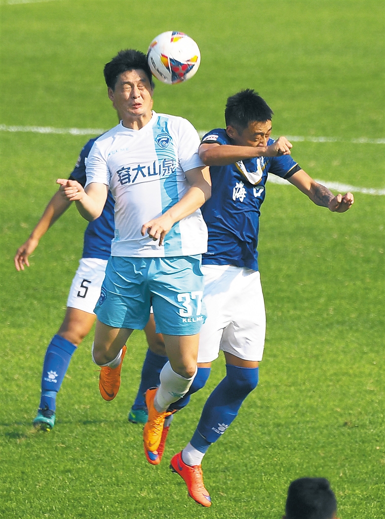 10月6日,在2018中国足球协会乙级联赛排位赛首轮比赛中,保定容大队客场以1∶0战胜海南海口队。图为保定容大队球员侯哲(前左)在比赛中争顶。 新华社记者 杨冠宇 摄