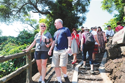 10月5日,外国游客在雷琼海口火山群世界地质公园观光游览。