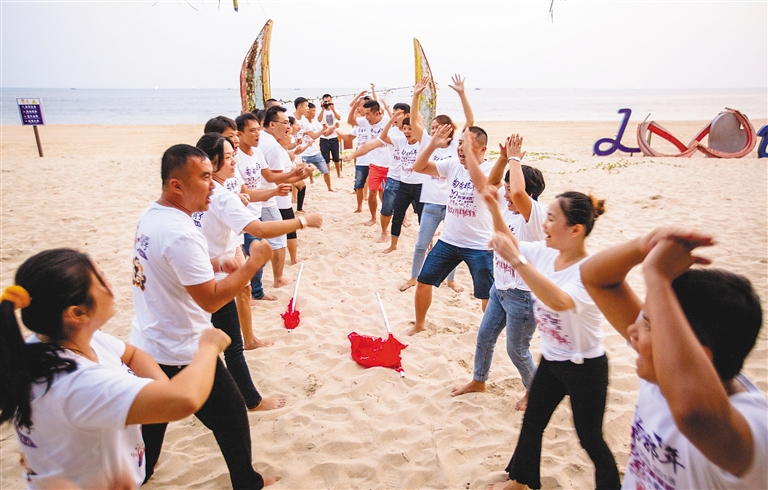 “一二三,游戏开始!”10月6日傍晚,在南湾猴岛南面的海滩上,来自琼海的周熙泰正在景区员工带领下和同伴们做游戏,在洁白的沙滩上追逐嬉戏。他们参加的是景区的“呆呆岛”海滩露营游。大海上,几艘摩托艇正劈波斩浪;海滩不远处,还有不少情侣在拍婚纱照。