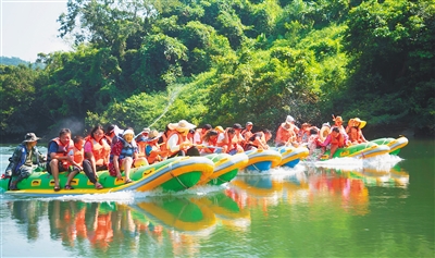10月7日,琼海万泉河峡谷漂流风景区,游客感受漂流的乐趣。本报记者 王凯 摄