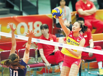 10月7日,女排世锦赛第二阶段比赛开战,中国队以3:0战胜泰国队。图为中国队球员龚翔宇(右)在比赛中扣球。 新华社发