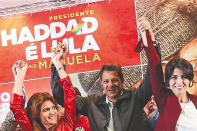 10月7日,在巴西圣保罗,劳工党总统候选人阿达(中)得知计票结果后庆祝。