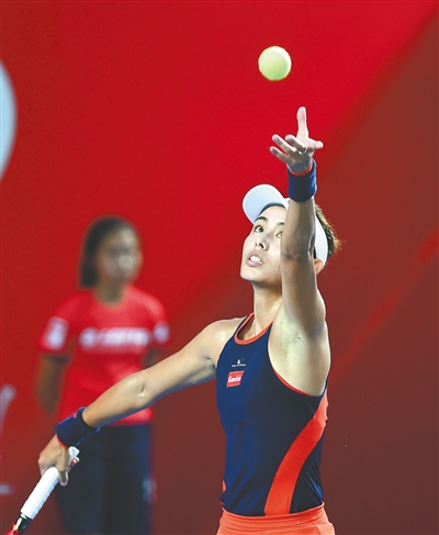10月9日,在香港举行的香港网球公开赛女子单打首轮比赛中,中国选手王蔷以2∶0战胜中国香港选手张玲,晋级下一轮。图为王蔷在比赛中发球。 新华社发