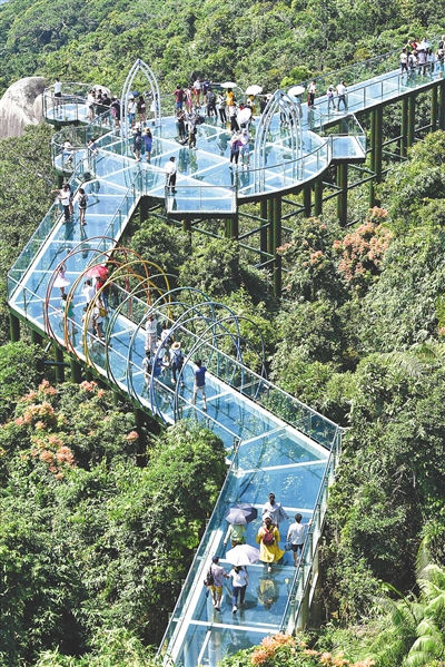 在三亚亚龙湾热带天堂森林旅游区,该景区新开辟的大佛石全海景玻璃栈道备受游客热棒。游客漫步在海拔450米高的玻璃栈道上,可尽揽亚龙湾山海连天的美丽风光,不少游客到此感受凌空而行的浪漫与刺激,该景区也成为我省又一个“网红打卡地”。据悉,受益于新项目带动,国庆黄金周期间,该景区接待中外游客9.96万人次,同比增长达95.11%。