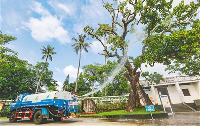 10月8日,在儋州市中和镇东坡文化旅游区,园林部门工作人员在给景区的绿化树浇水。今年以来,随着“一创两建”工作的推进,儋州各镇及旅游景区的园林环卫工作逐渐规范化,农村人居环境明显改善,景区旅游环境得到提升。