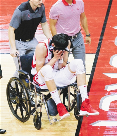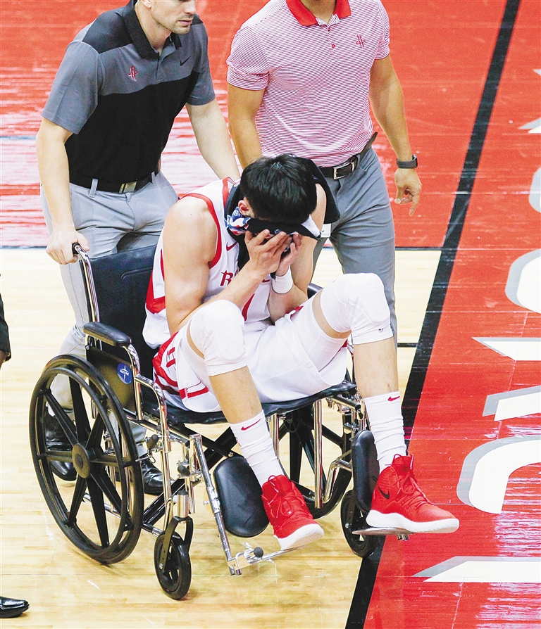 10月10日,在美国休斯敦举行的2018-2019赛季NBA季前赛中,休斯敦火箭队球员周琦在与上海大鲨鱼队球员斯科拉的拼抢中左膝受伤,随后被工作人员用轮椅推出场外就医。