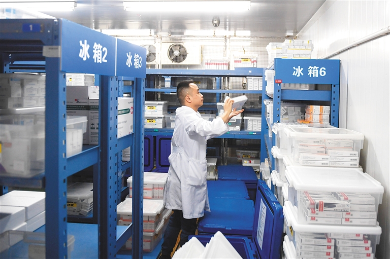10月10日,工作人员在浙江大学医学院附属第二医院的药品仓库取药。