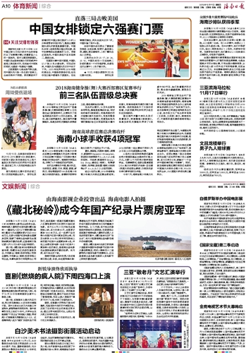 海南日报 体育新闻 文娱新闻 010 2018-10-111 2018年10月11日 星期四