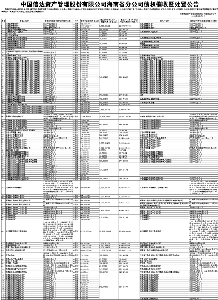 中国信达资产管理股份有限公司海南省分公司债权催收暨处置公告