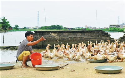 10月9日,海口市美兰区灵山镇爱群村,脱贫户俞诗长为咸水鸭投食。据了解,俞诗长因病致贫,在政府的帮助下,成为当地的养殖技术能手,养了200多只咸水鸭。俞诗长还“触网”成为一名微商,通过微信朋友圈销售咸水鸭。