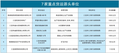 据了解,根据海南省交通运输厅转发《海南省联合治理货车超限超载工作领导小组办公室转发交通运输部关于2018年全国治理车辆超限超载工作要点的通知》等文件要求,结合三亚市实际情况,近期三亚市治超办组织相关成员单位对该市货运源头单位进行了重新摸底调查和汇总界定。通过对全市所有从事砂石料、搅拌站、钢材、水泥、建材等生产经营的大型企业、运输站场及其它从事道路货运装载、配货的企业进行重新摸底、排查,并依据货物吞吐量、装载运输情况等,最终确定了三亚华盛水泥粉磨有限公司、海南瑞泽新型建材股份有限公司、三亚花岗石材料厂、三亚华盛新混凝土有限公司、三亚蓝钻混凝土配送有限公司、海南南宝石矿产开采有限公司、三亚磊明材料有限公司等7家企业为该市重点货运源头单位。
