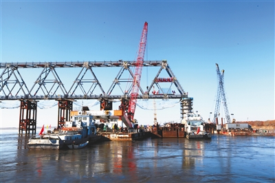 10月13日上午,中俄同江-下列宁斯阔耶铁路桥重要组成部分——黑龙江特大桥中方最后一吊钢梁安装到位,标志着同江中俄铁路大桥中方段主体工程全部完成。