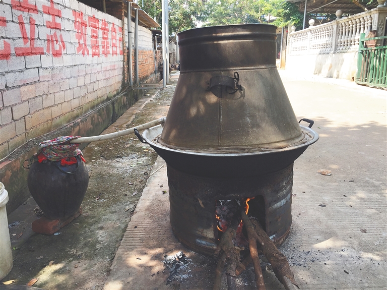 节前在玉龙和玉道两村探访,最有特色的是看到家家户户为过节而自备米酒,散发出别样的村味儿。村道上,支起一个个大锅,旺火烧起,盖上水桶样的盖子密封,中间一个细管输出水蒸气(酒)流入旁边的酒瓮里。据村干部说,黎家人备酒过节,早在两三个月前就会先煮上一大锅饭,放入酒曲搅拌,静置倒入桶里,存上几个月,到了节前再将它倒入大锅里,加一点水,用大火旺烧,做成香甜的米酒待客来。