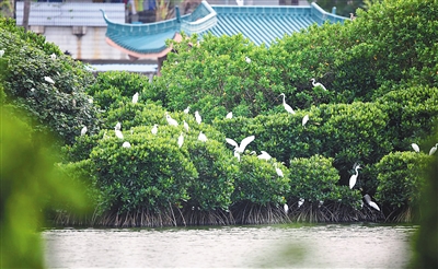 10月13日下午,海南大学东坡湖湖心岛红树林湿地,八哥、丝光椋鸟、大白鹭、牛背鹭、池鹭等鸟类前来栖息、繁衍,在碧绿湖水、葱茏树木的映衬下,犹如一幅风景画。