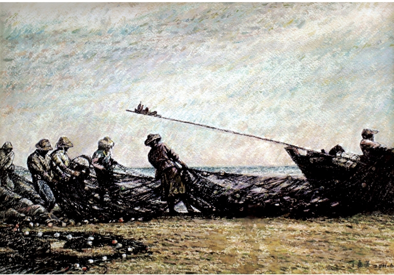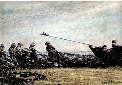 画家丁孟芳是以画海见长的油画家,在水彩作品《渔歌·归》与《渔歌·网》中我们看到,她用柔软的水彩,画出了有肌理感的沙滩,画幅小中见大,静谧的画面,却让人感受到苍茫大海雷霆万顷的磅礴之势,显示出“古老渔歌,生生不息”的精神。这两幅作品取材于万宁石梅湾,《渔歌·归》于2010年入选“第九届全国水彩画·粉画展”,获优秀作品奖;《渔歌·网》于2011年入选“第二届全国小幅水彩画展”,可谓是本届画展的“压箱底之作”。