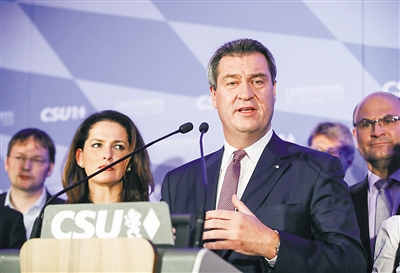 10月14日,在德国慕尼黑,德国巴伐利亚州州长马库斯·泽德(前中)在选举初步结果公布后发表声明。