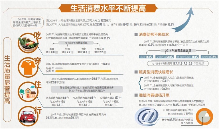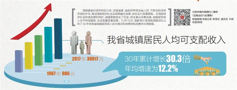 海南建省办经济特区以来,历届省委、省政府带领全省人民,不断加快改革开放的步伐,推动海南经济社会实现跨越式发展,综合实力显著提高。在海南经济社会快速发展的同时,城镇面貌发生了巨变,民生事业改善加速,城镇居民收入水平持续提高,生活质量显著改善。10月15日,国家统计局海南调查总队公布了30年来我省城镇居民收入变化情况和消费结构改善优化等数据。