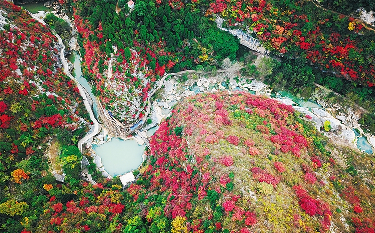 金秋时节,甘肃省陇南市成县西狭颂景区层林尽染,峡内石崖、池潭、树木、山峰构成五彩斑斓的秋日美景图,引人入胜。