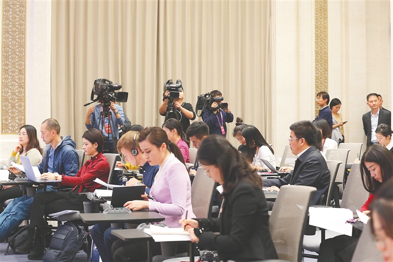 10月16日下午,国务院新闻办公室举行《中国(海南)自由贸易试验区总体方案》新闻发布会,吸引众多国内外媒体关注。图为新闻发布会现场。