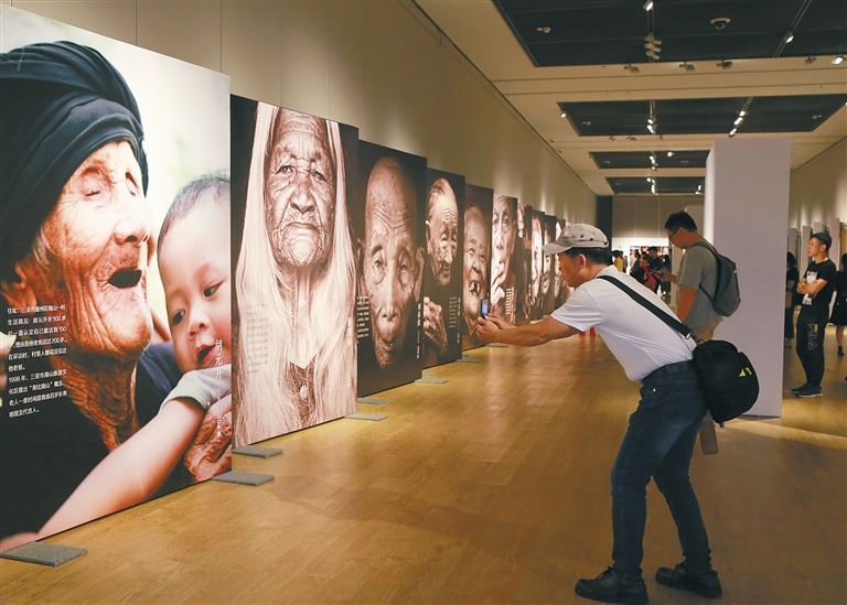 在“百岁寿者”部分中,高锐度的肖像照片中,百岁老人面庞上深深的纹壑与爽朗的笑容形成鲜明对比,给人们带来视觉冲击。照片中的百岁老人们来自海南的多个市县,策展团队为每一个老人配上文字说明,让参观者了解“面容”背后的故事。