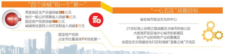 省会城市政治文化的中心、21世纪海上丝绸之路战略支点城市的核心区、大南海开发区域中心城市的新都区、新兴产业和特色产业的聚集区、全国生态文明建设先行区和海南“首善之城”示范区——依托独特的区位优势,得天独厚的交通、海洋、生态等资源优势,新型工业、现代农业聚集等产业优势,秀英正朝着“一心五区”战略目标阔步前行。